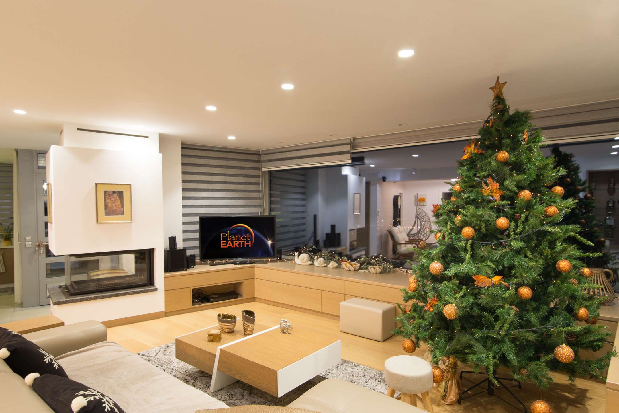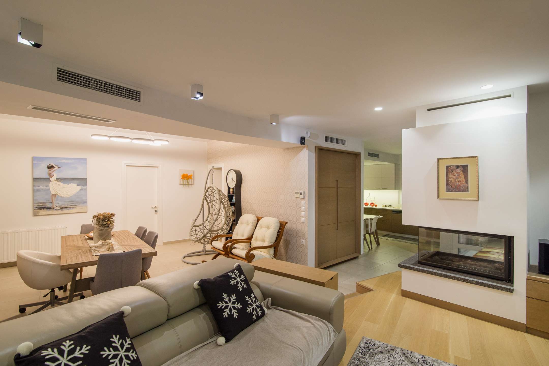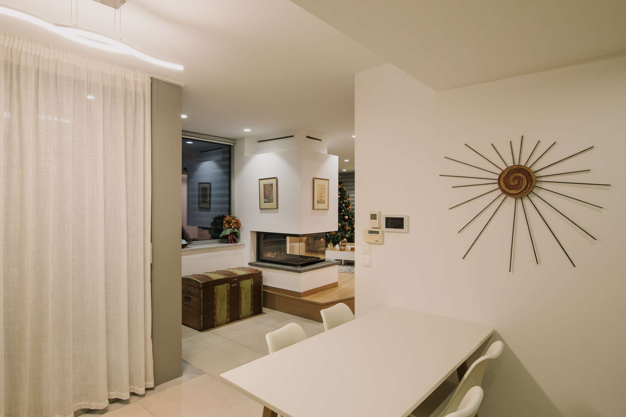In this residence, dropped ceilings were built, in which the air condition units were hidden. Plasterboard partitions shape the spaces while the fireplace is lined with fireproof plasterboard.
